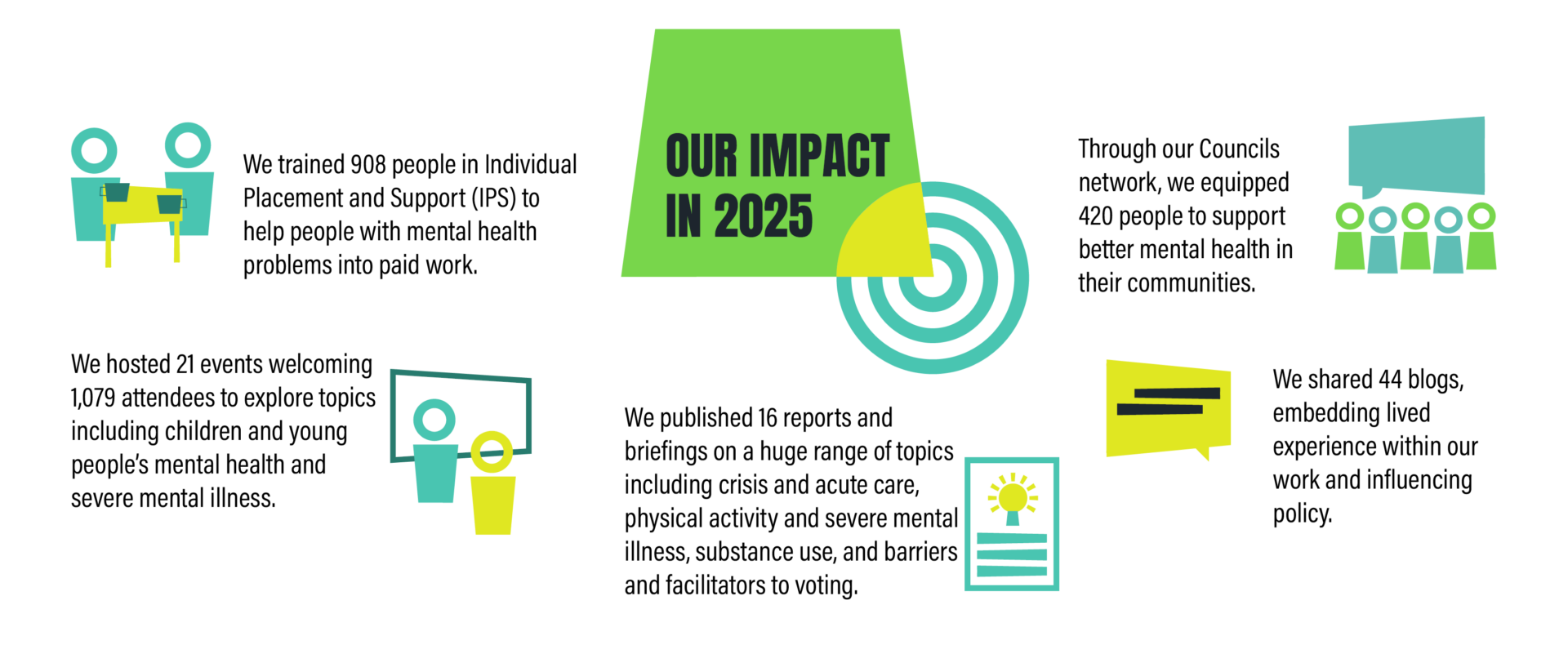 - We supported 420 people representing 168 councils through our Mentally Healthier Councils network, championing good mental health in communities across the UK