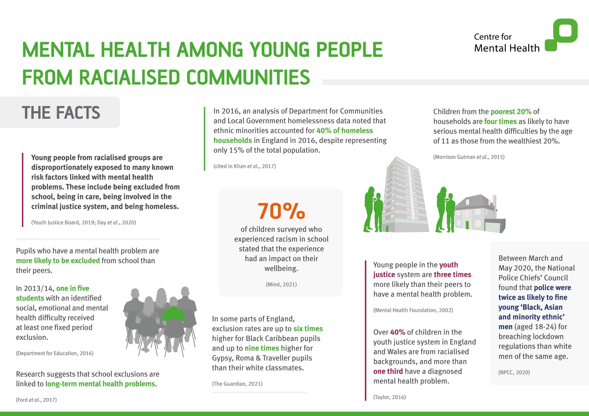 Young people from racialised communities are exposed to more of the risk factors related to poor mental health, such as racism, school exclusion, poverty, and being in care.