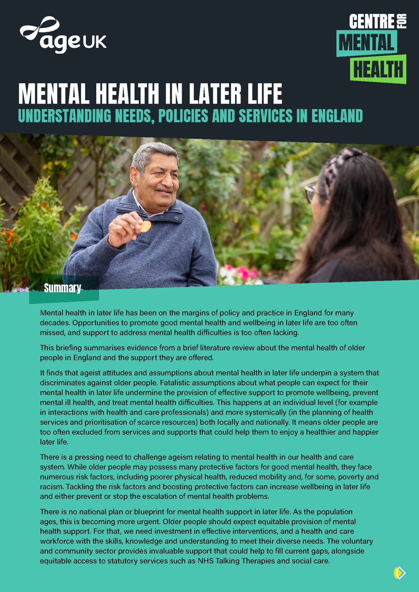 Commissioned by Age UK, this briefing summarises evidence about the mental health of older people in England. It finds that ageist attitudes underpin a system that discriminates against older people, while fatalistic assumptions about what people can expect for their mental health in later life undermine the provision of effective support to promote wellbeing, prevent mental ill health and treat mental health difficulties.