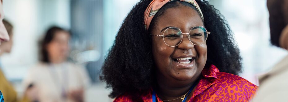 A Black woman with curly hair wearing round glasses, a colorful patterned headband, and a bright red and pink leopard print top is smiling while in conversation with work colleagues.