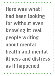 In the way that journalism is described as the first draft of history, online discussion about mental health between people who live with it is like the first draft of an infinite number of possible new understandings of mental health. What I found in the blogs of the first decade of the twenty-first century I now find in the ever-growing; ever-chaotic, ever-surprising world of social media.
