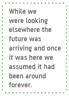To think about the future we need to be able to see where we have come from; to reach backwards to understand how things came into being and what came before them. The future doesn’t arrive in orderly ways. It arrives uncomfortably and unannounced; elbowing you in the ribs and sitting in your favourite chair. It arrives in gaps and awkward pauses; in talking at cross purposes and in arguments. It arrives in last thoughts before sleep that grip your heart like an icy hand and in the things you see out of the corner of your eye when you’re trying to concentrate on something else.