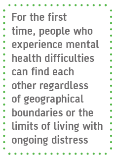 Finding other people who lived with mental health difficulty and distress online changed my life. It continues to change my life every day. It was people with mental health difficulties using social media that made me. Collectively we are making something and somewhere for the future that has never existed before.