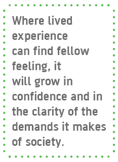 As atomised individuals living with mental health difficulty we moved through our experiences like detectives, sure that something had happened somewhere but with no clues or leads to follow. Knowledge and ideas and understanding followed set paths. Unless you met the right people or found the right book or newspaper or magazine, knowledge and ideas remained forever out of view, a secret club into which you had to be inducted step-by-step. Only if you were lucky enough to find the gap in the fence that led through to the secret garden did you ever know there was anything else on the other side of the high hedges of accepted ideas and opinions. We often lived our distress and experience and difference from those around us as a kind of second, hidden life; never knowing if anyone around us was carrying a secret past or present themselves. We lived and we suffered and we died never finding a home for this other story of ourselves. In this isolation, our insights, our experiences, our ideas were like beautiful plants turned to dry leaves and rot when we were no longer there to tend them.